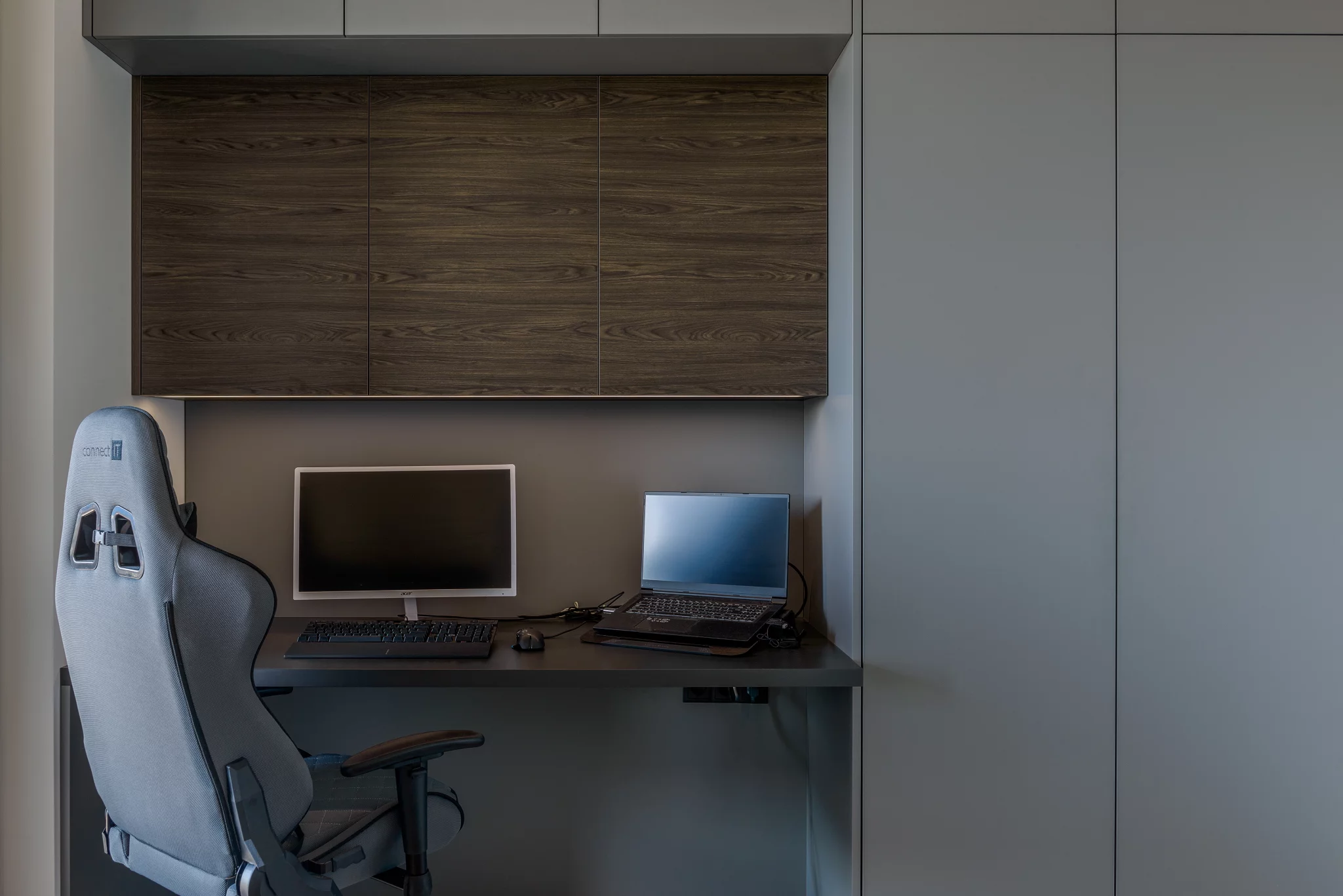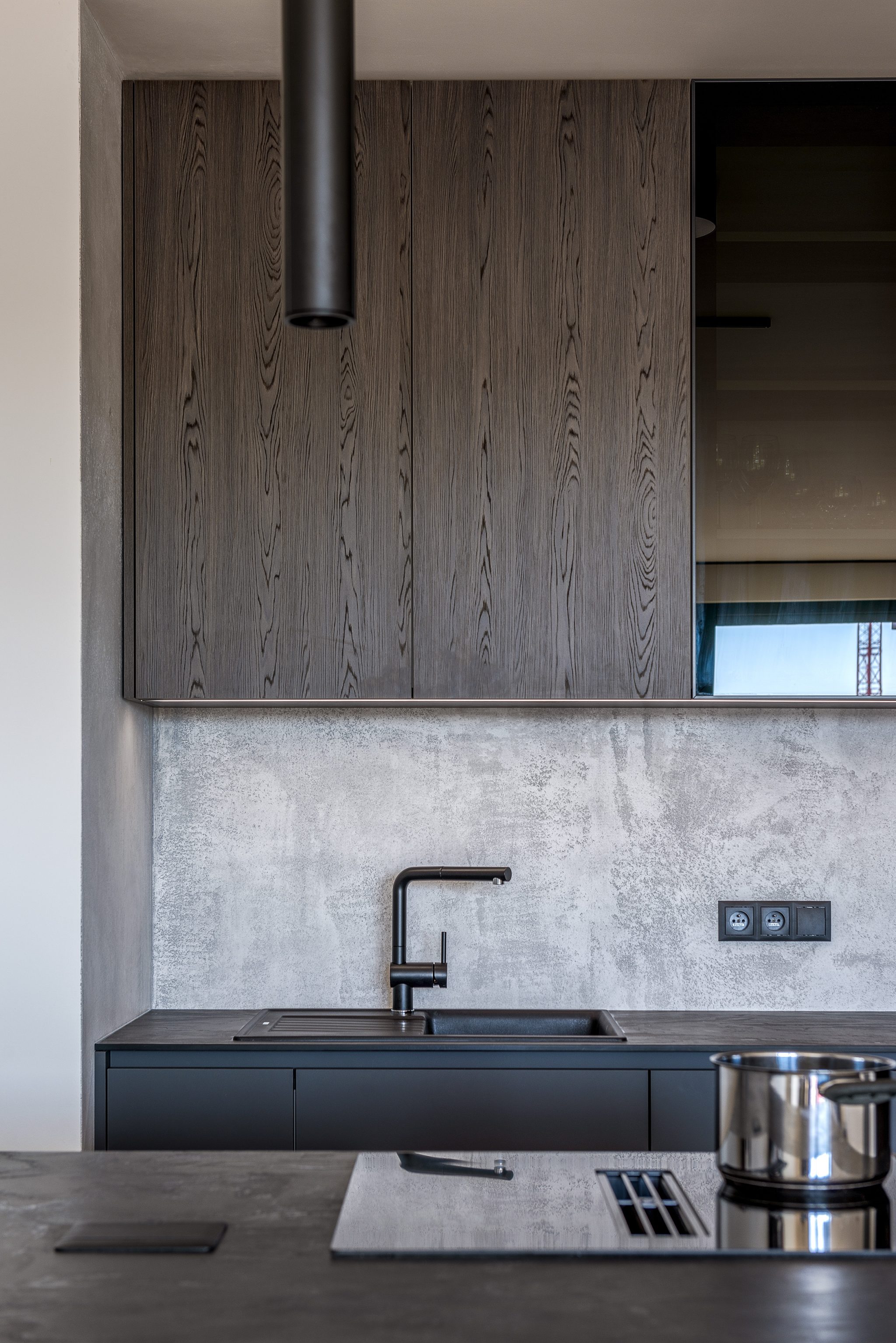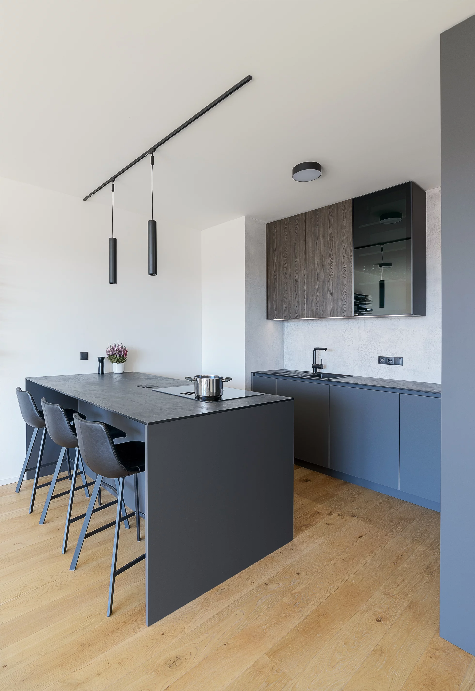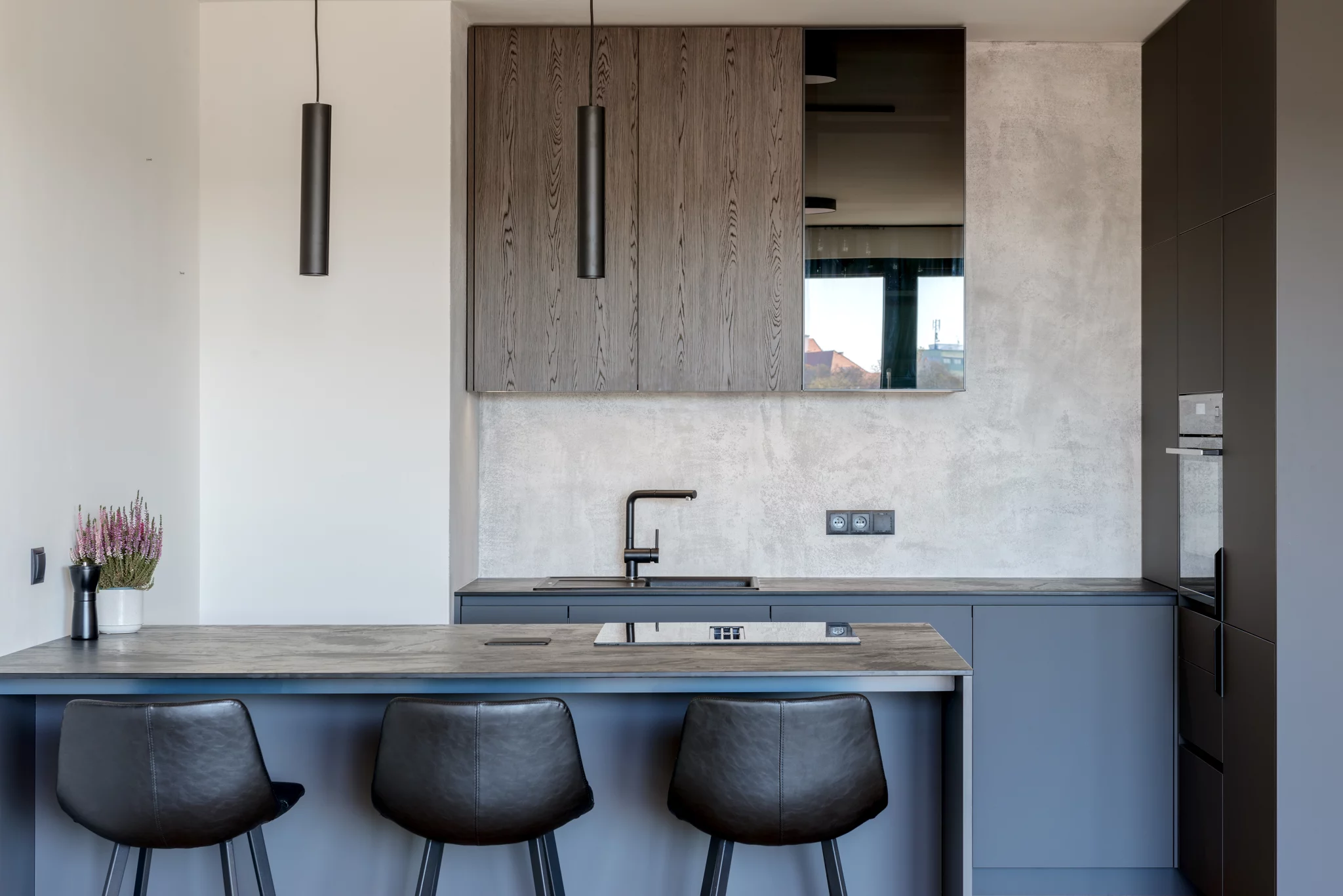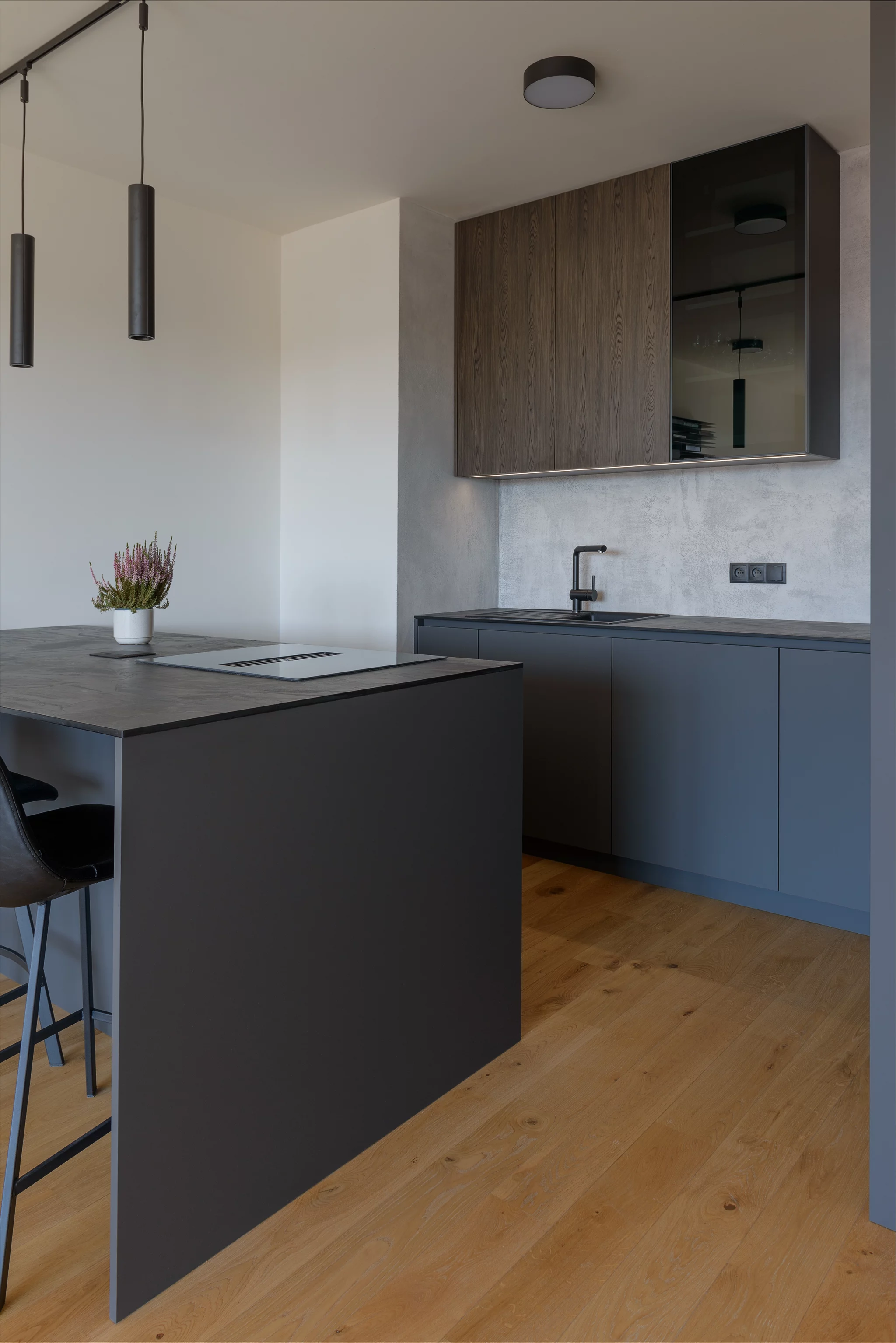Barevně jsme zvolili odstíny šedé a antracitové, doplněné o tmavý elegantní dřevodekor a kuchyňskou pracovní desku s imitací břidlice.