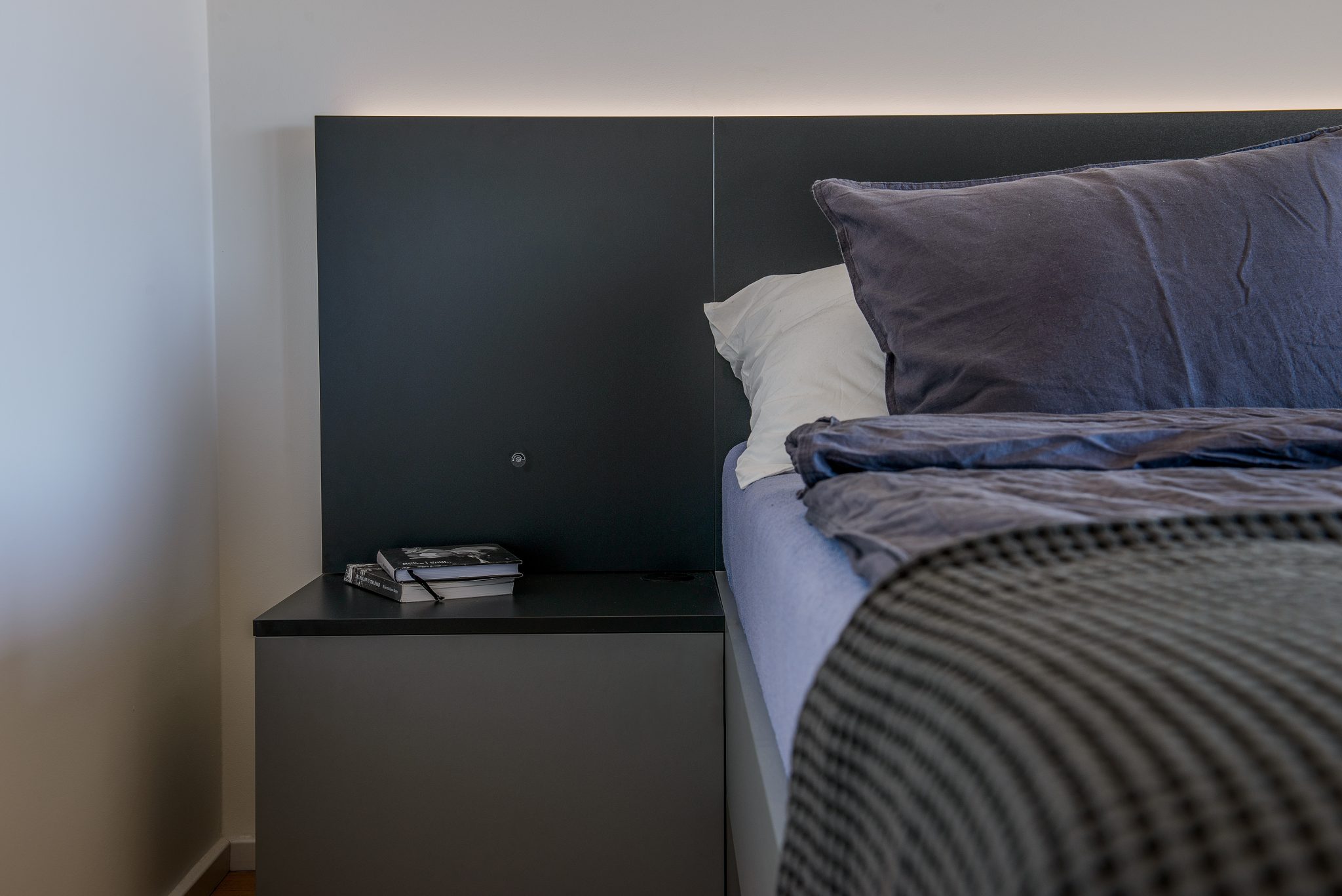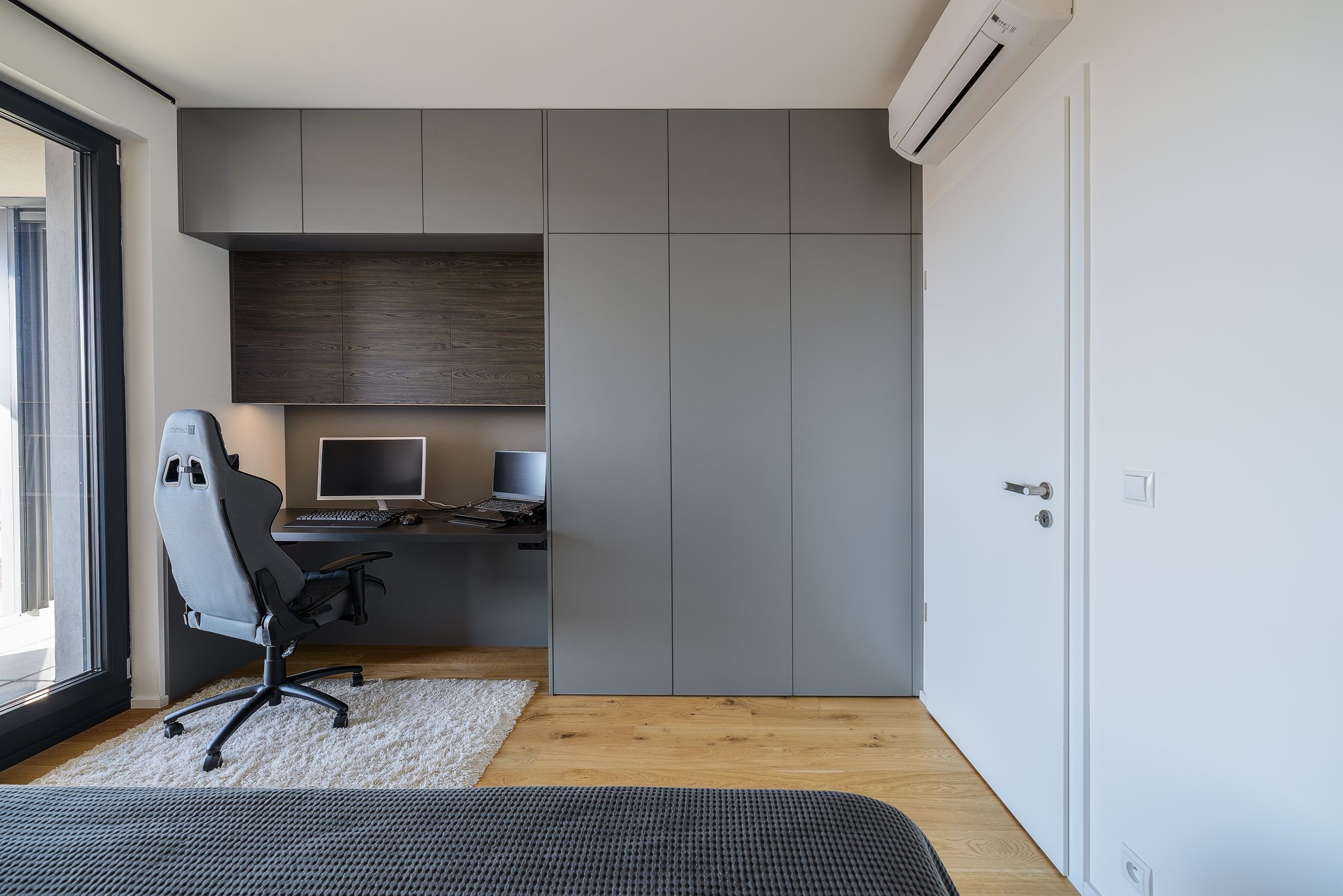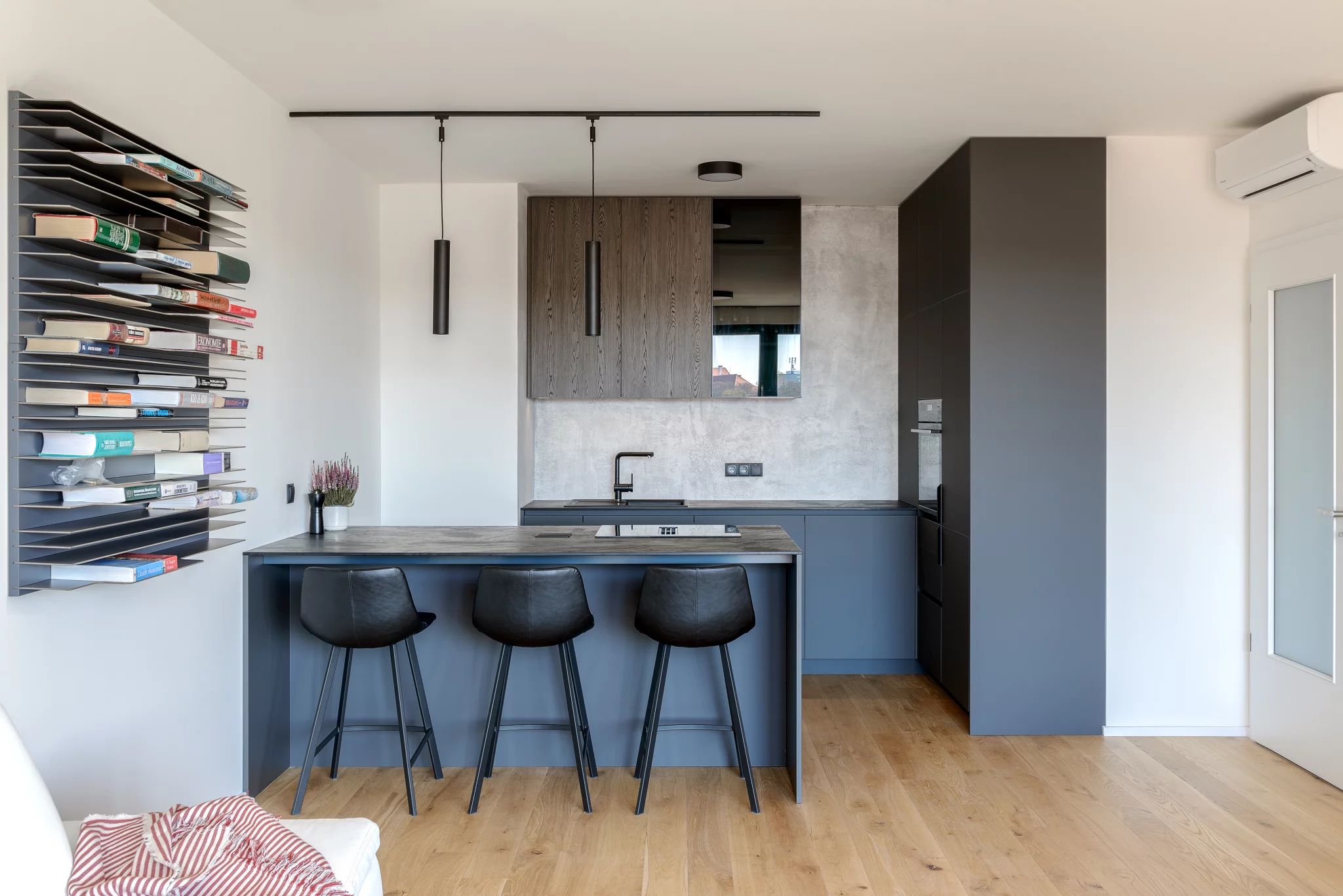 Klient nás oslovil s návrhem a vybavením bytu 2kk v budově Alfa. Byt byl koncipován pro mladý pár, který má rád jednoduchý a elegantní design, dostatek úložného prostoru, funkční a praktickou kuchyňskou linku a pracovní prostor pro častou práci z domu.