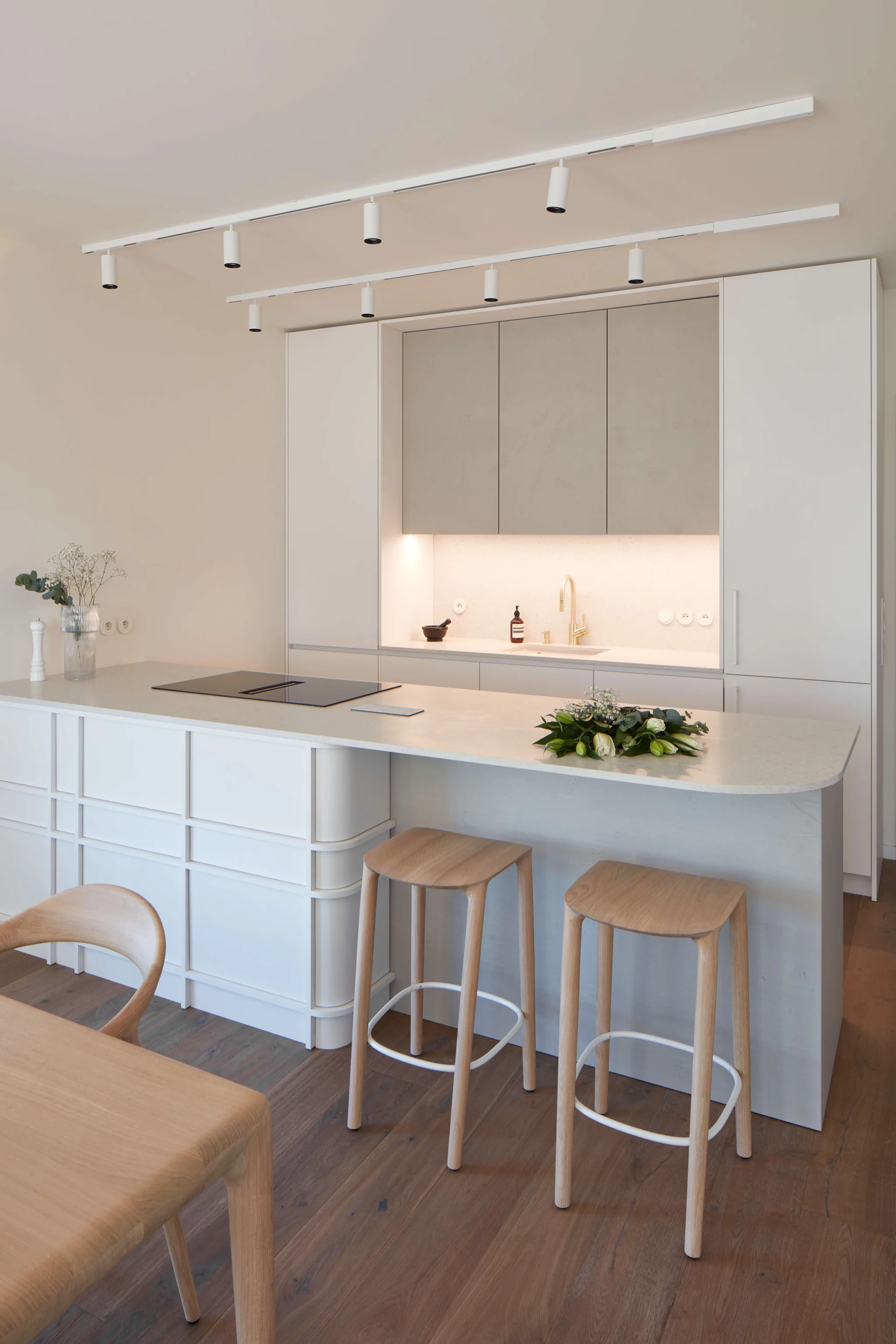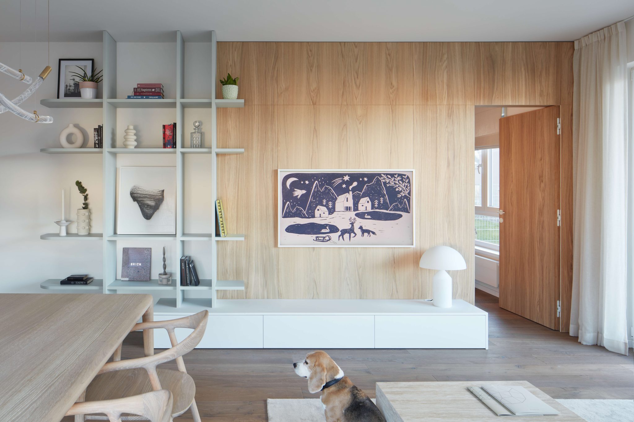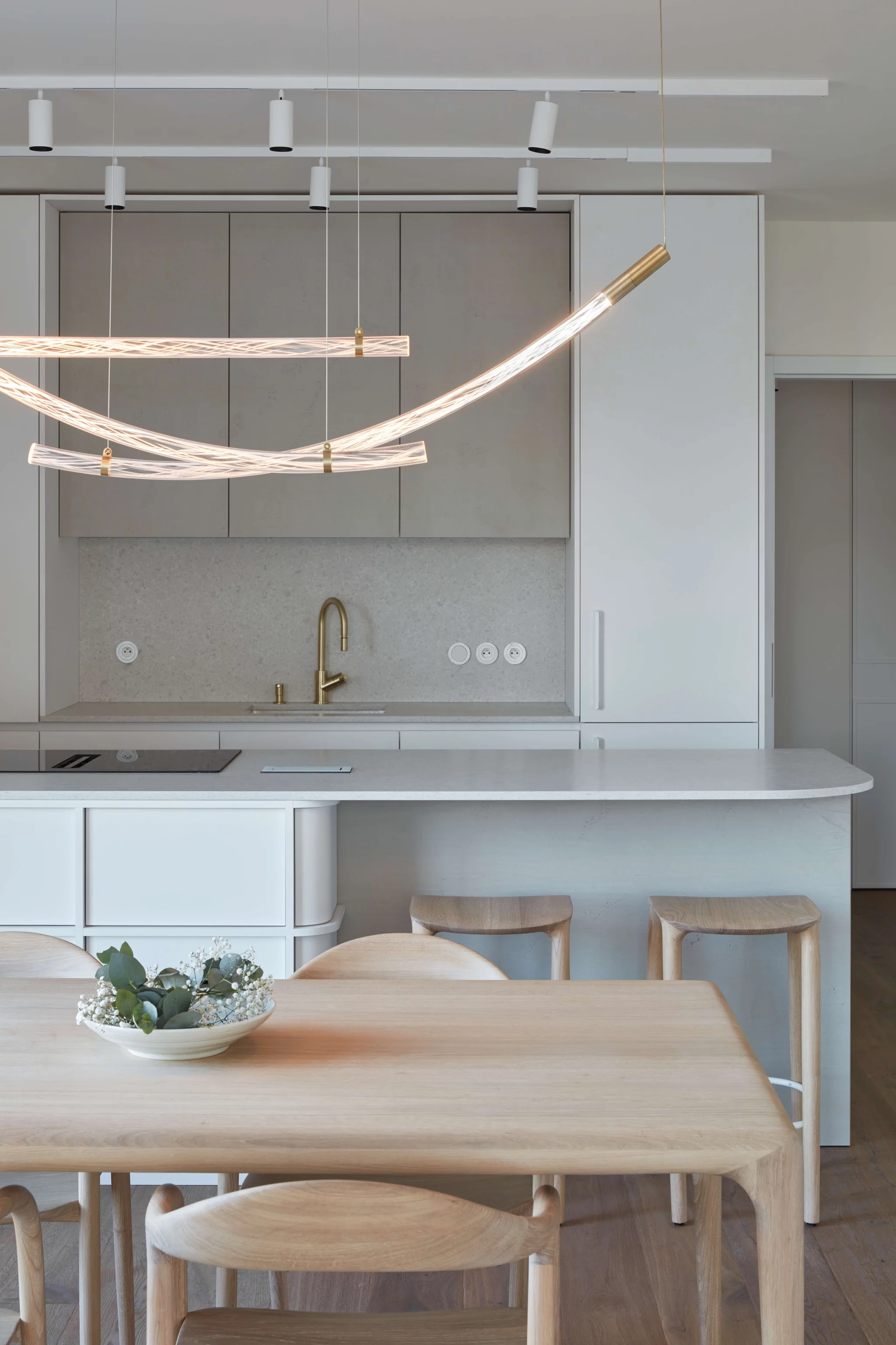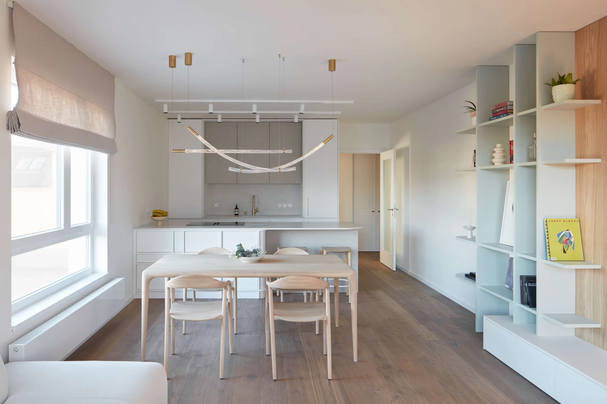 Proces návrhu pražského interiéru blízko Vltavy o dispozici 4+kk se nesl v duchu hledání harmonie jemných a světlých barevných tónů, které prostupují celým prostorem. Jemnost je v návrhu podpořena oblými prvky a čistotou jednotlivých linií, kdy se významnou dominantou bytu stává světlo Flare od značky Bomma nad jídelním stolem a na jeho tvar navazující kuchyňský ostrůvek.