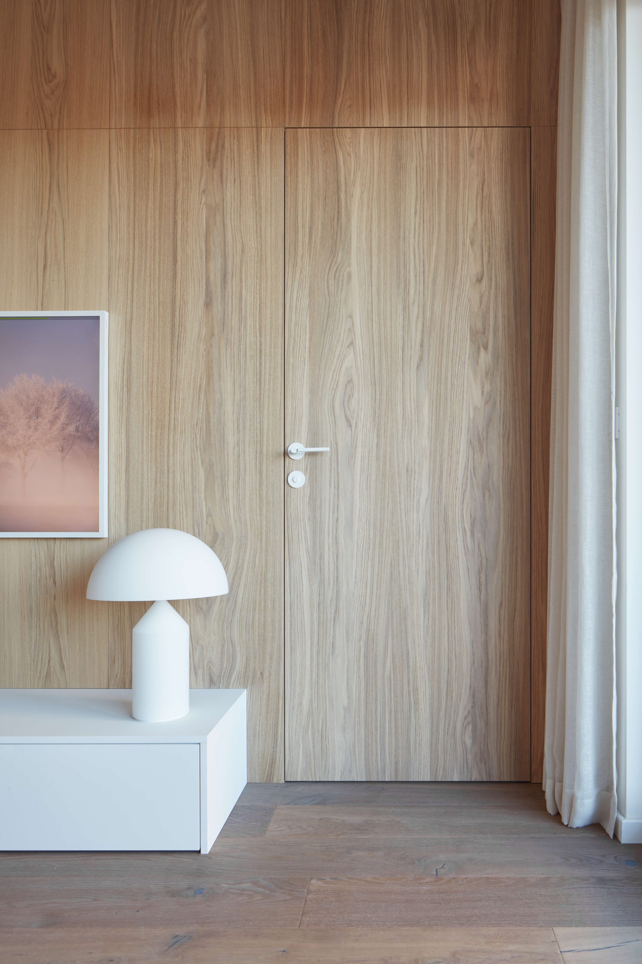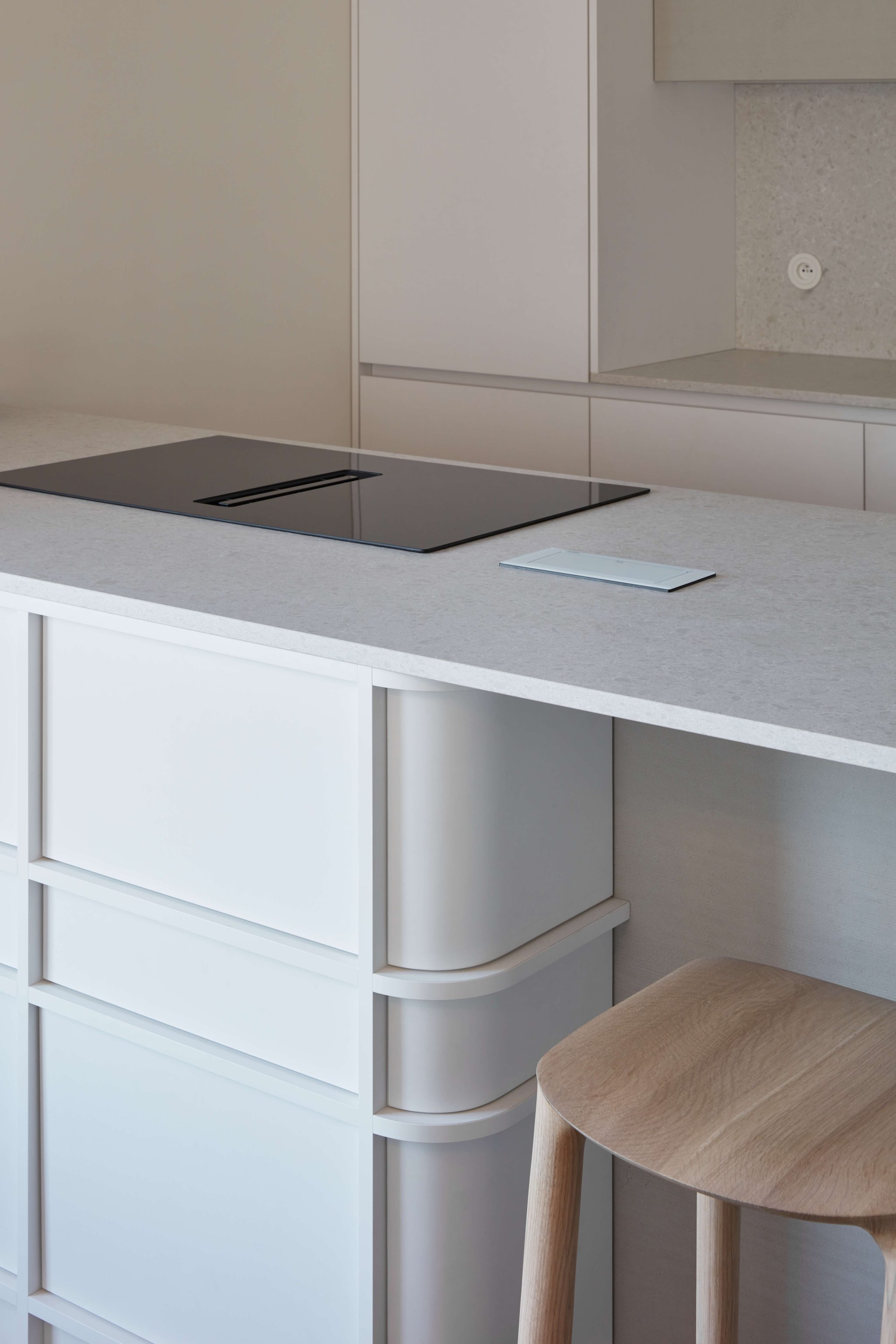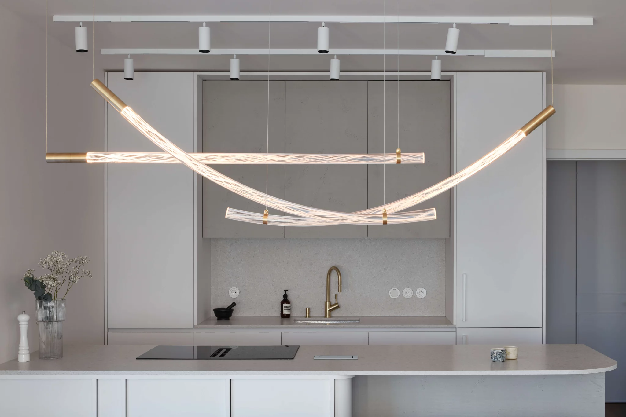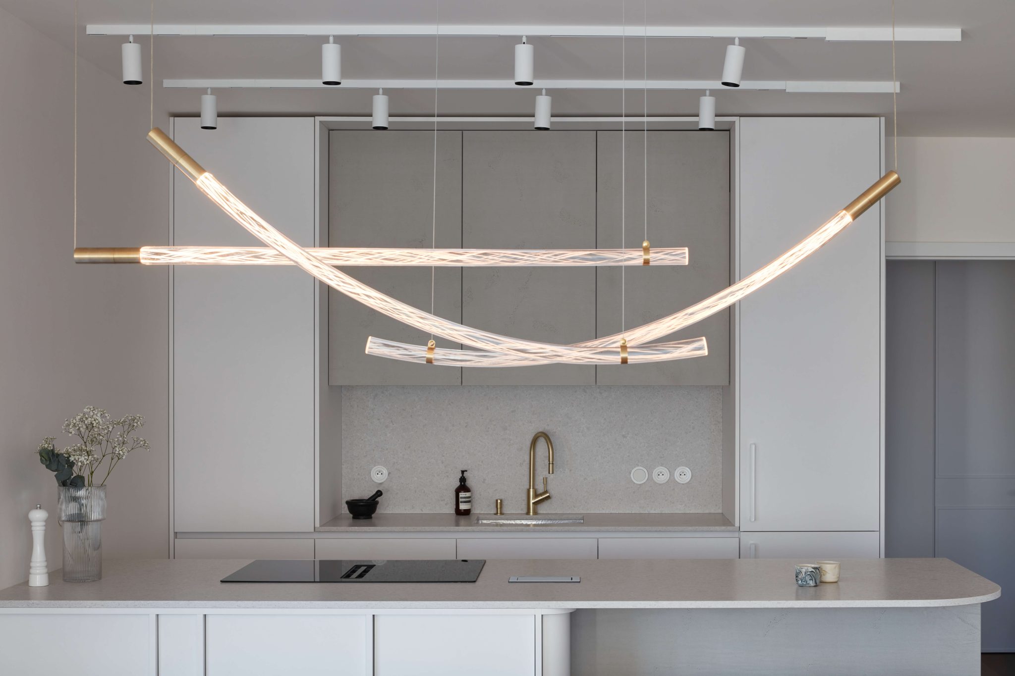 Proces návrhu pražského interiéru blízko Vltavy o dispozici 4+kk se nesl v duchu hledání harmonie jemných a světlých barevných tónů, které prostupují celým prostorem. Jemnost je v návrhu podpořena oblými prvky a čistotou jednotlivých linií, kdy se významnou dominantou bytu stává světlo Flare od značky Bomma nad jídelním stolem a na jeho tvar navazující kuchyňský ostrůvek.