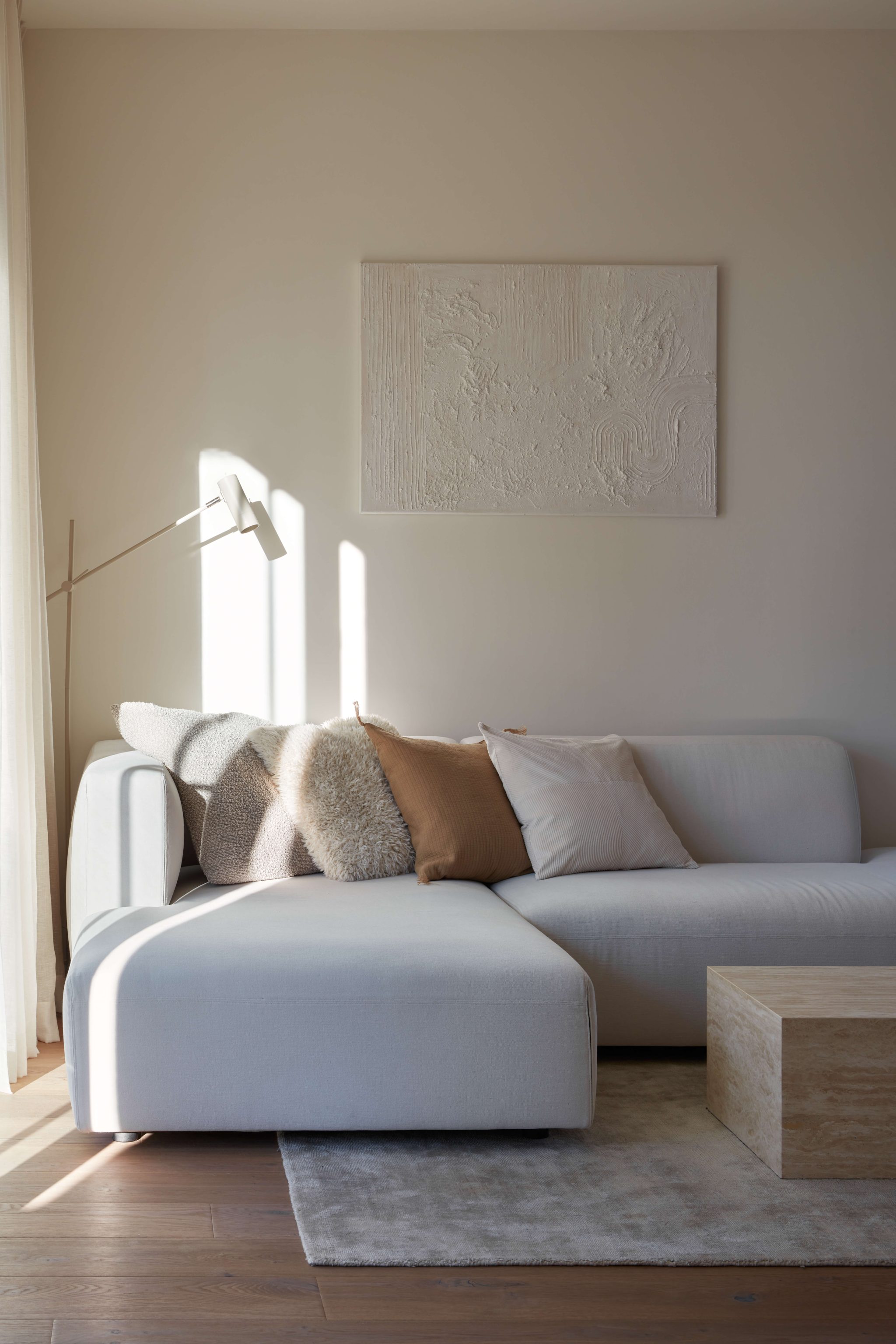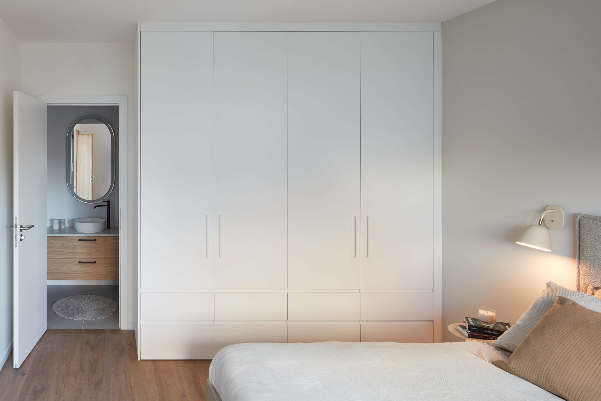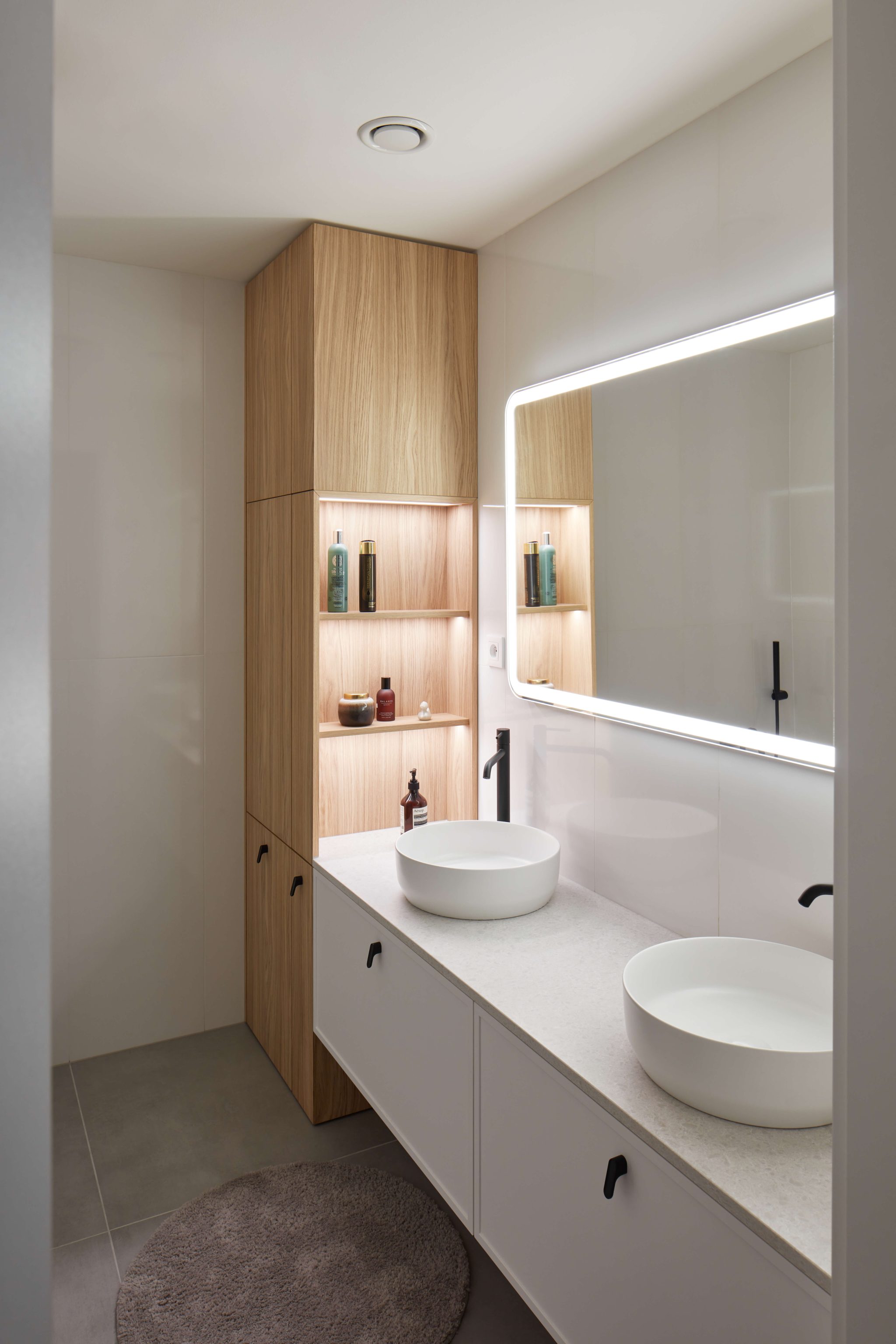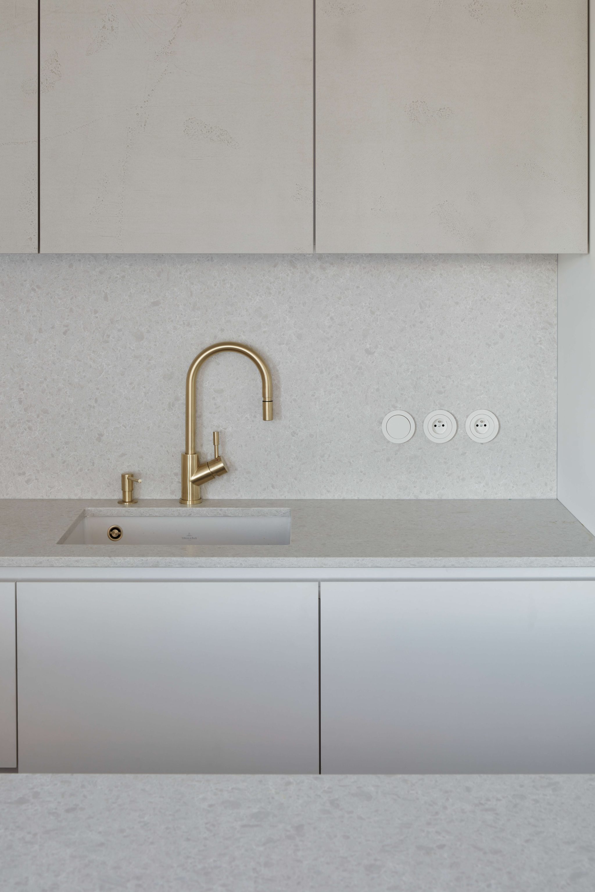 Proces návrhu pražského interiéru blízko Vltavy o dispozici 4+kk se nesl v duchu hledání harmonie jemných a světlých barevných tónů, které prostupují celým prostorem. Jemnost je v návrhu podpořena oblými prvky a čistotou jednotlivých linií, kdy se významnou dominantou bytu stává světlo Flare od značky Bomma nad jídelním stolem a na jeho tvar navazující kuchyňský ostrůvek.