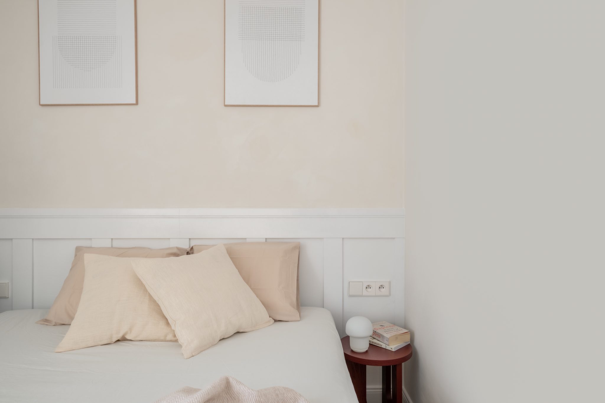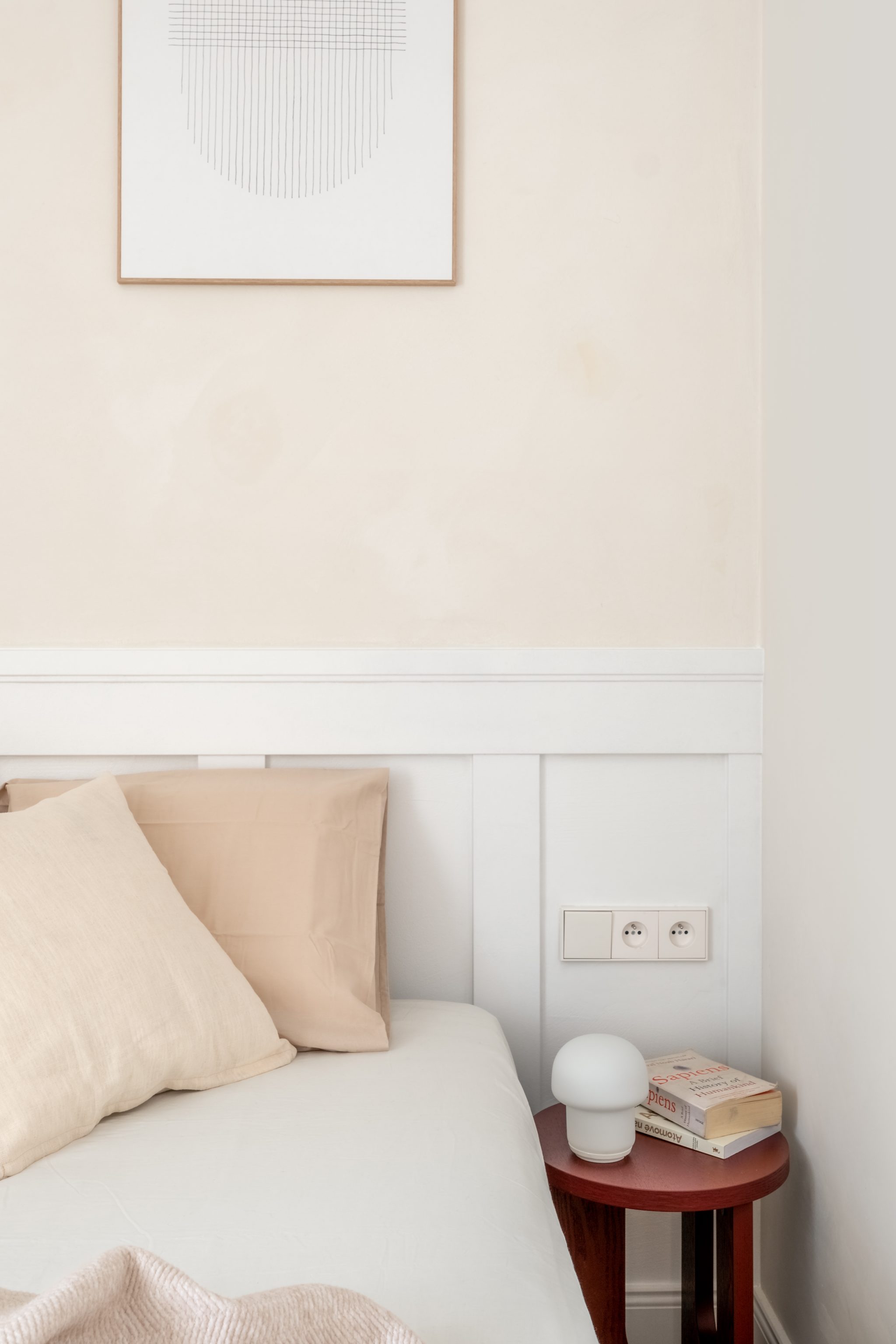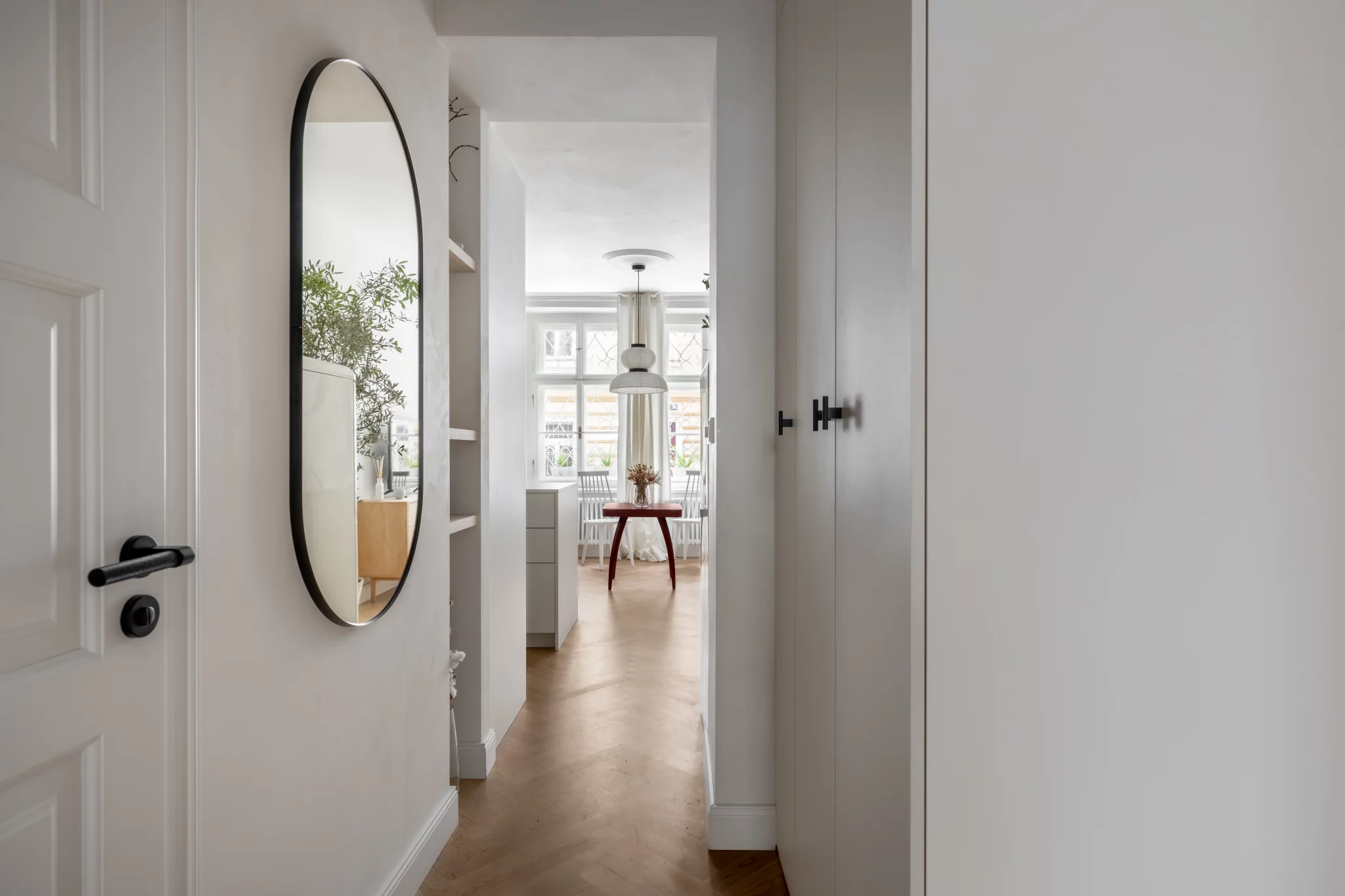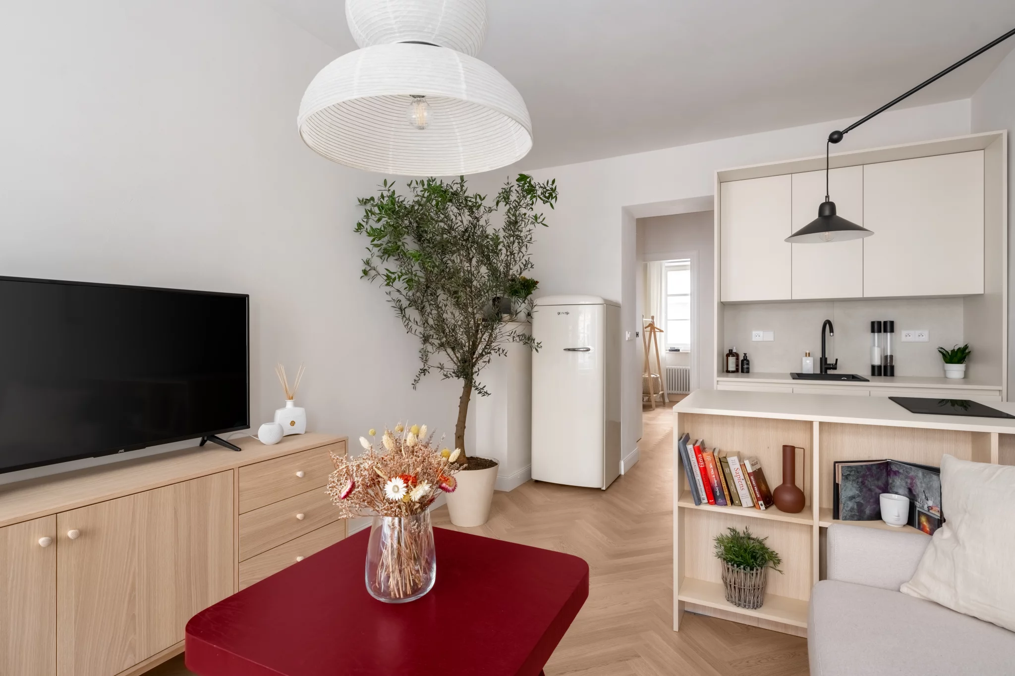 Interiér a jeho styl respektuje okolní prostředí starých Vršovic. Koncept designu interiéru je založen na krémových odstínech a běleném dřevodekoru, v každé místnosti je jeden vínově červený prvek. Na zdech je vápenná malba – Limewash, která koreluje s retro nádechem bytu. V koupelně jsme místo standardních keramických obkladů zvolili betonovou stěrku. Dřevěná podlaha skládaná do vzoru parket byla téměř samozřejmostí. Interiér jsme decentně doplnili o ozdobné soklové lišty, stropní rozety a kazetové dveře.