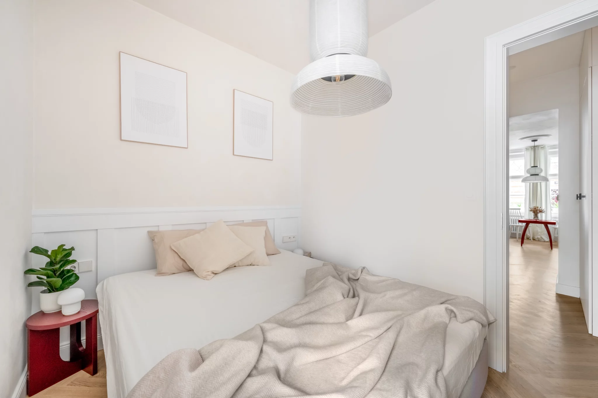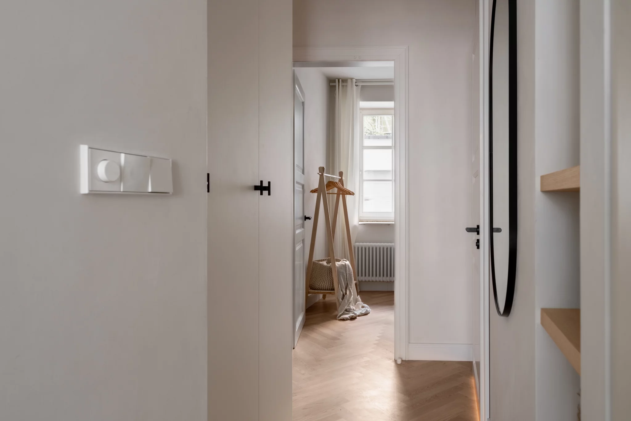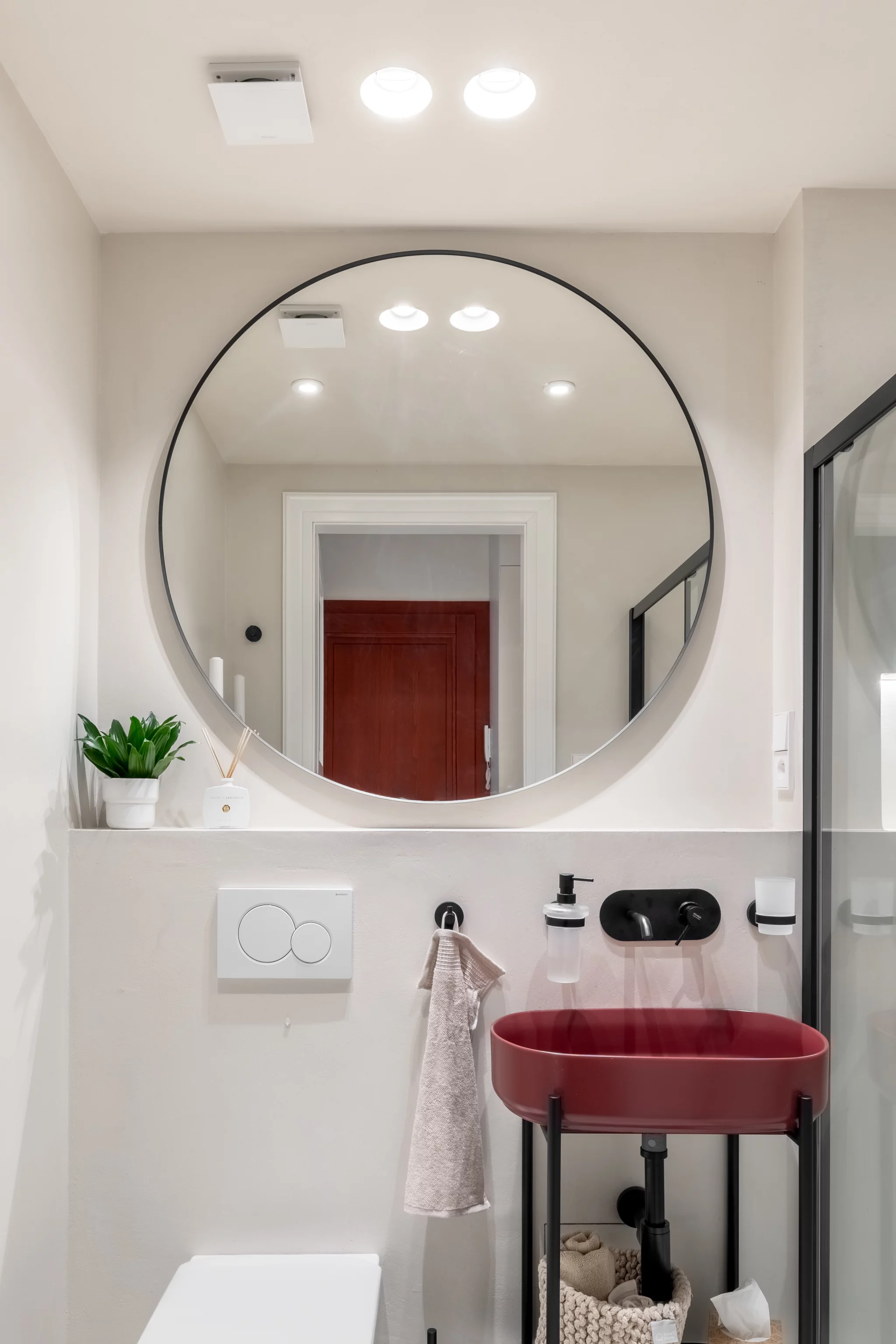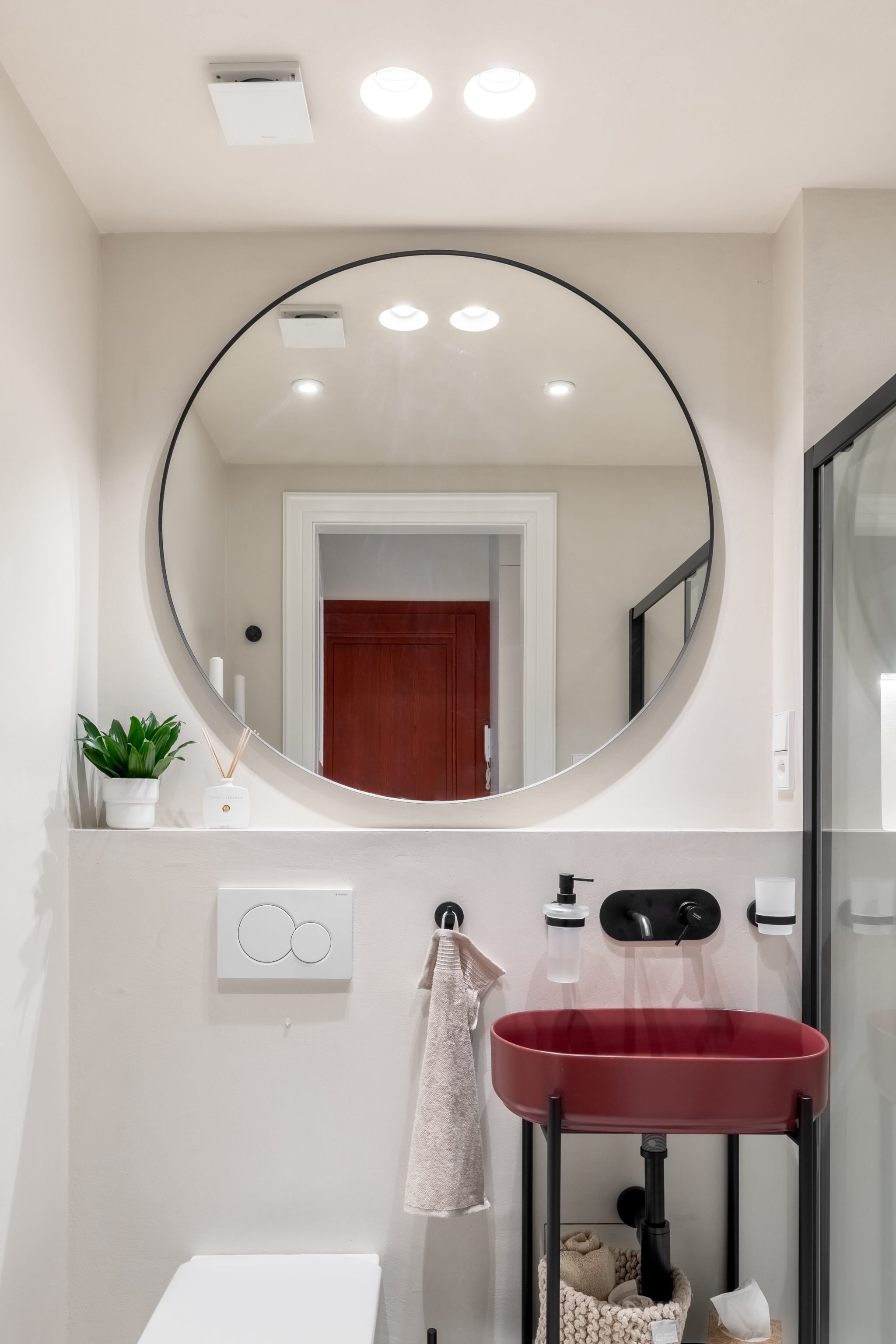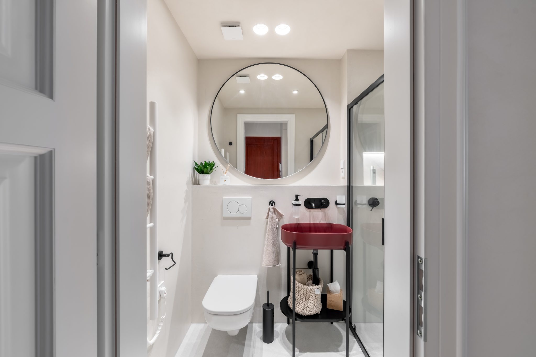 Interiér a jeho styl respektuje okolní prostředí starých Vršovic. Koncept designu interiéru je založen na krémových odstínech a běleném dřevodekoru, v každé místnosti je jeden vínově červený prvek. Na zdech je vápenná malba – Limewash, která koreluje s retro nádechem bytu. V koupelně jsme místo standardních keramických obkladů zvolili betonovou stěrku. Dřevěná podlaha skládaná do vzoru parket byla téměř samozřejmostí. Interiér jsme decentně doplnili o ozdobné soklové lišty, stropní rozety a kazetové dveře.