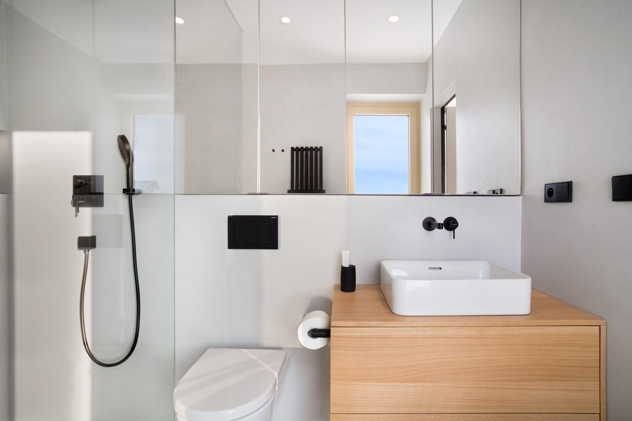 Koncové prvky sanity a elektra jsou navrženy v matném černém provedení. Černé detaily dodávají interiéru závěrečný akcent a kontrast. Zbylé stěny jsou opatřeny bílou výmalbou, díky čemuž interiér působí velmi světlým dojmem.