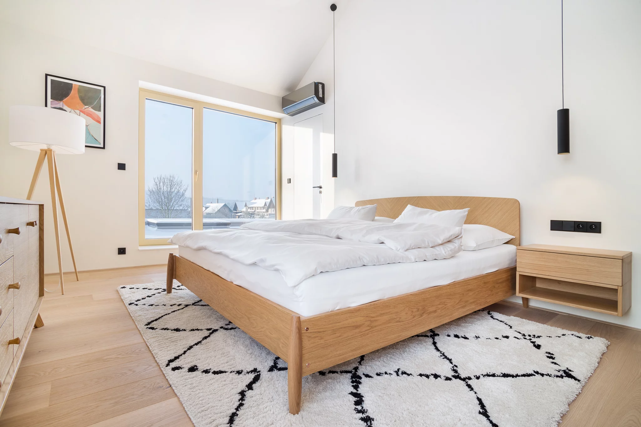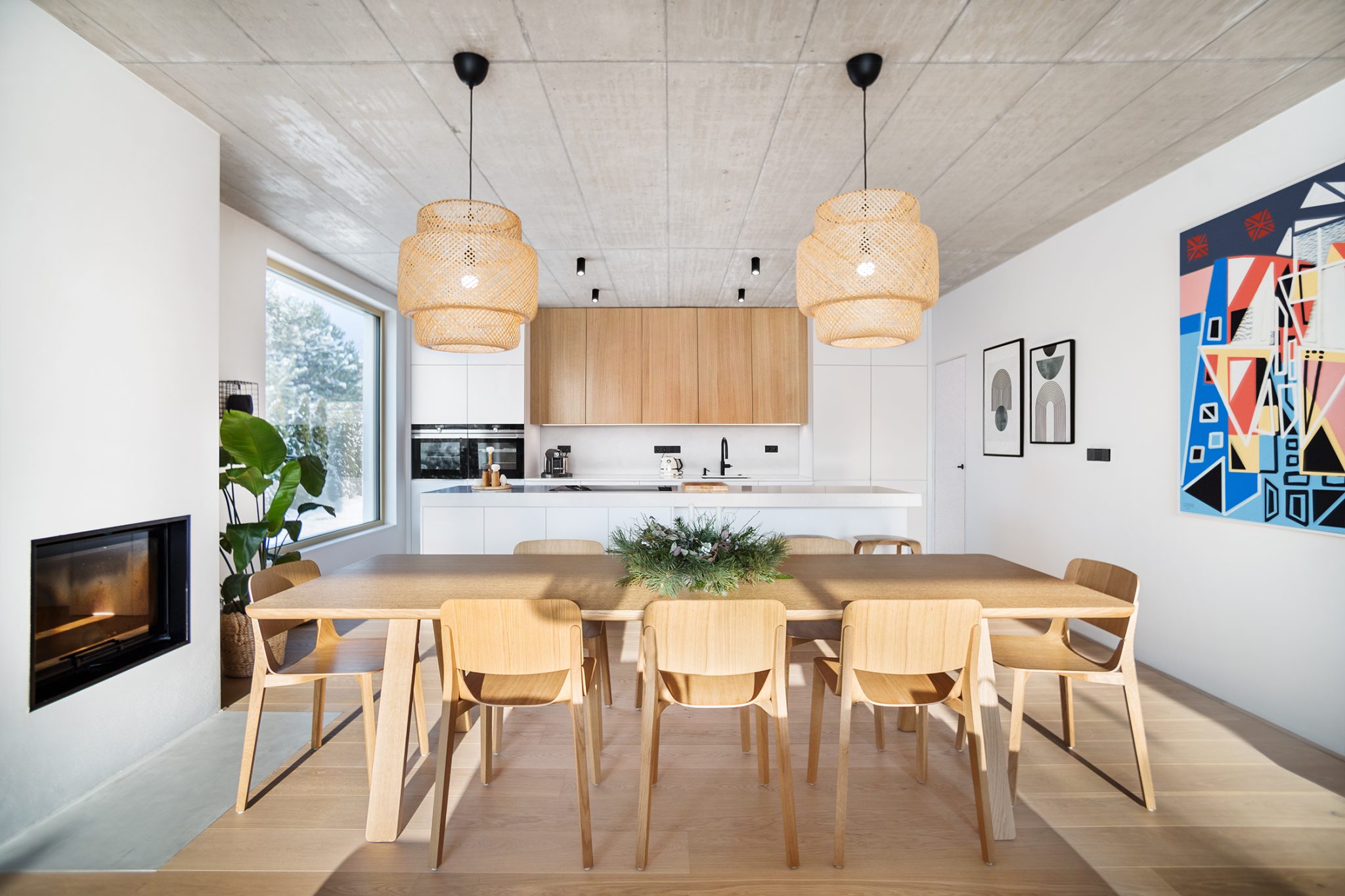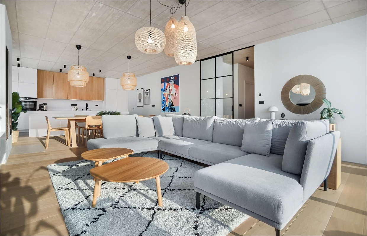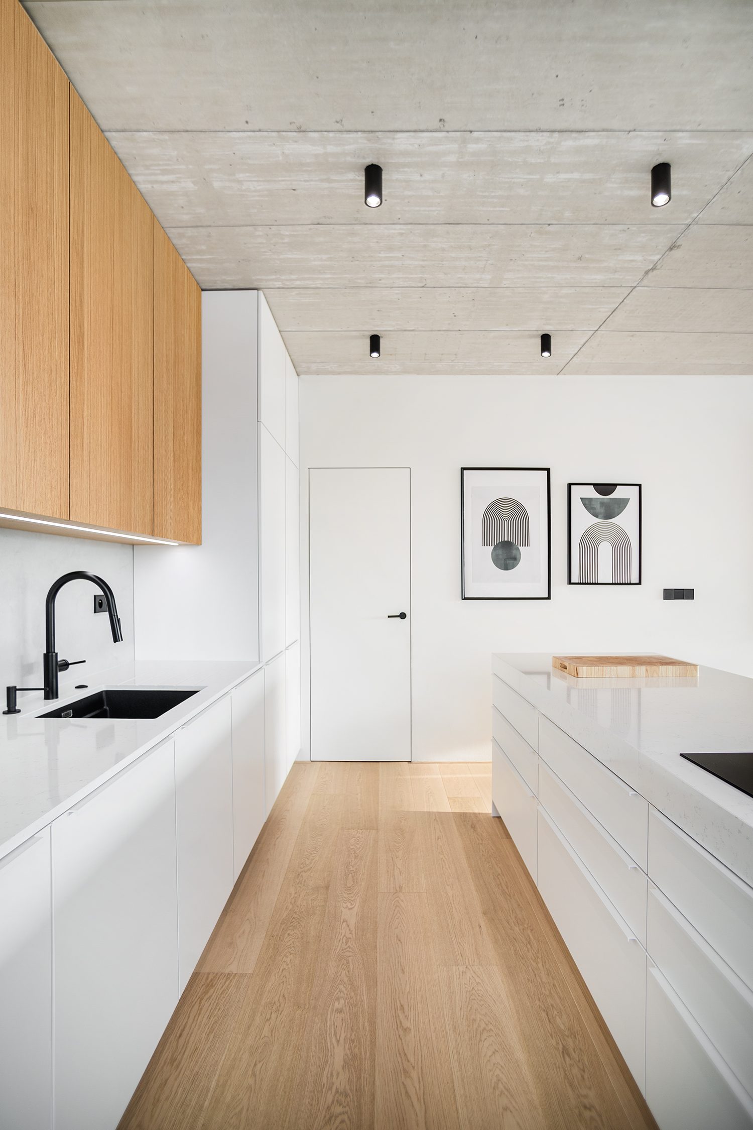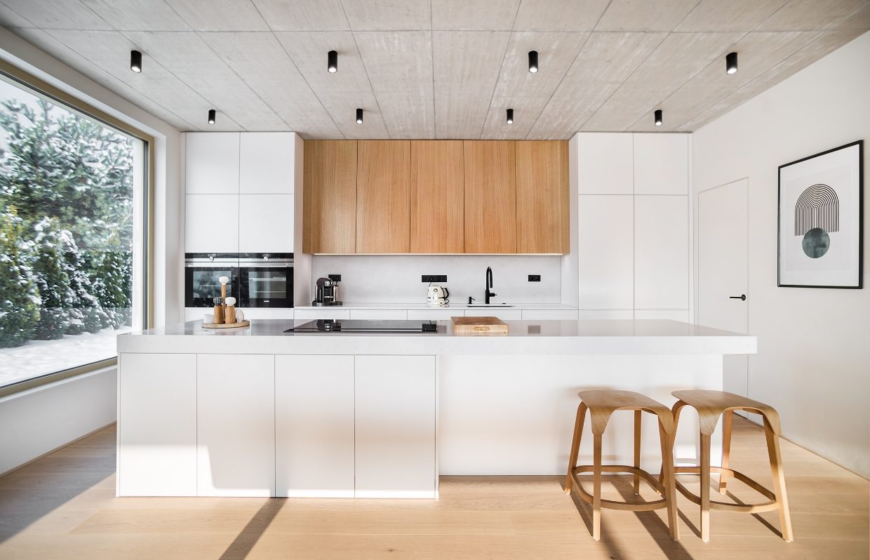 Realizace interiéru rodinného domu Vestec. Protože šlo o dům podle našeho návrhu, interiér plynule navazuje na exteriér. Stejně jako vně se barevná škála skládá z bílé, šedé a dřevodekoru.