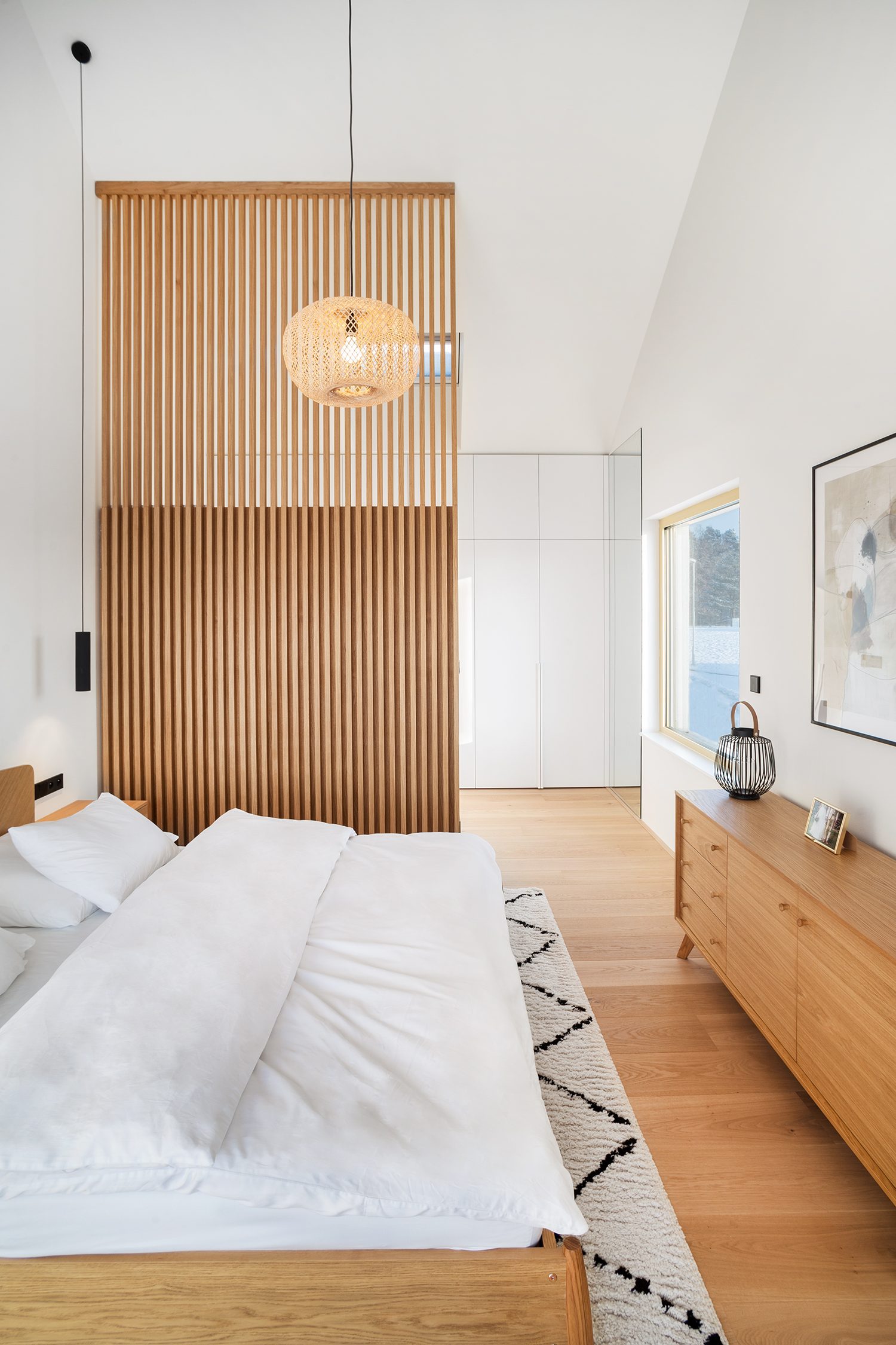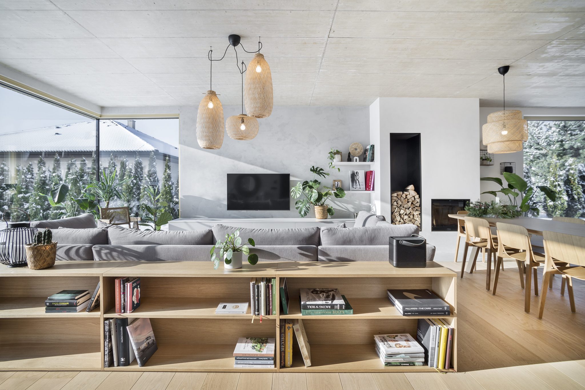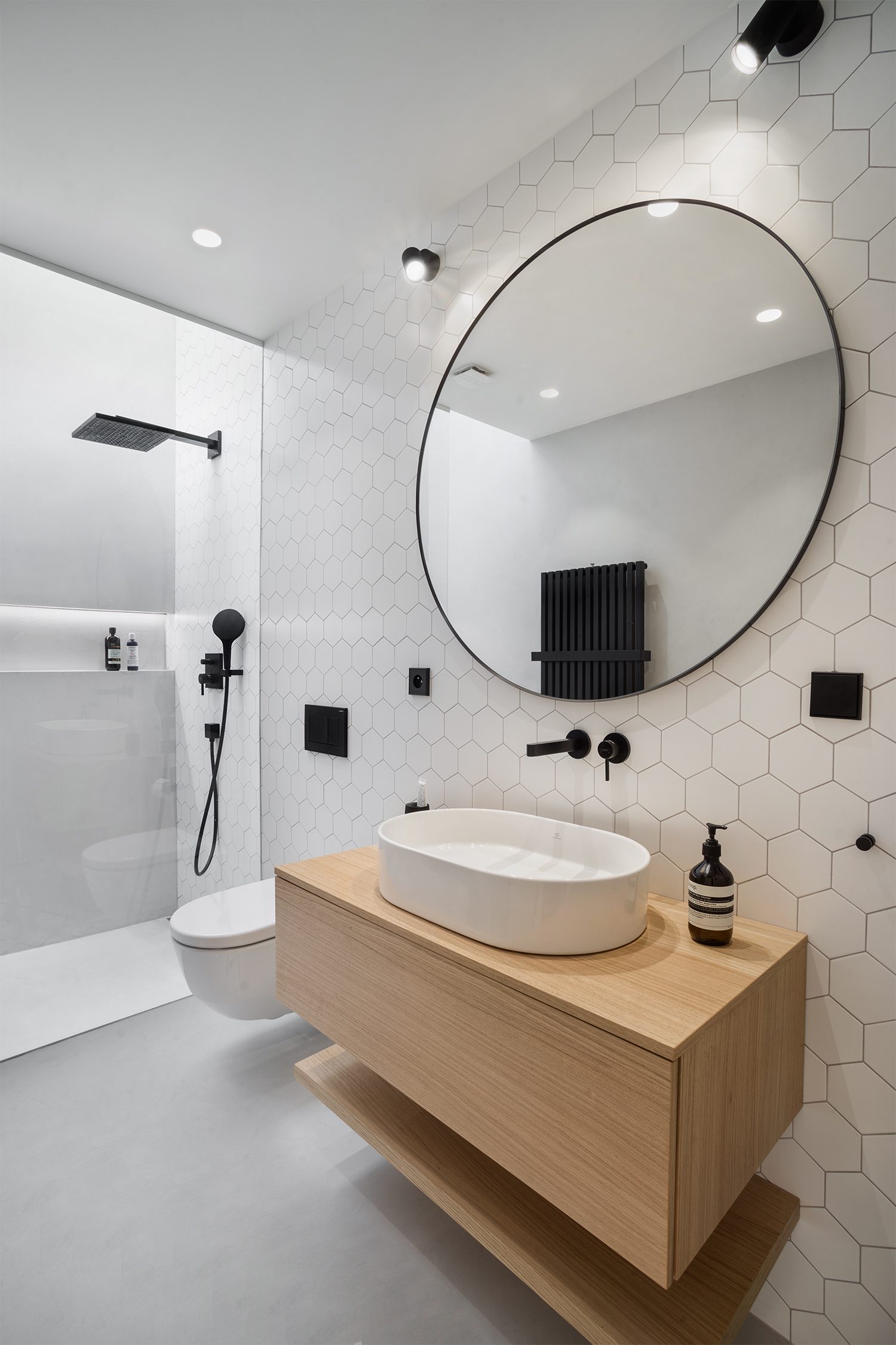 V interiéru dřevo zatupuje dub v podobě bělené dubové podlahy a přírodní dubové dýhy na nábytku a truhlářských prvcích. Spodnímu patru a především hlavnímu obytnému prostoru dominuje přiznaný železobetonový strop s výraznými otisky bednění. Stěny a podlahy koupelen jsme nechali potáhnout betonovými hydrofobními stěrkami, dominantní stěna má vždy keramický obklad z hexagonů.